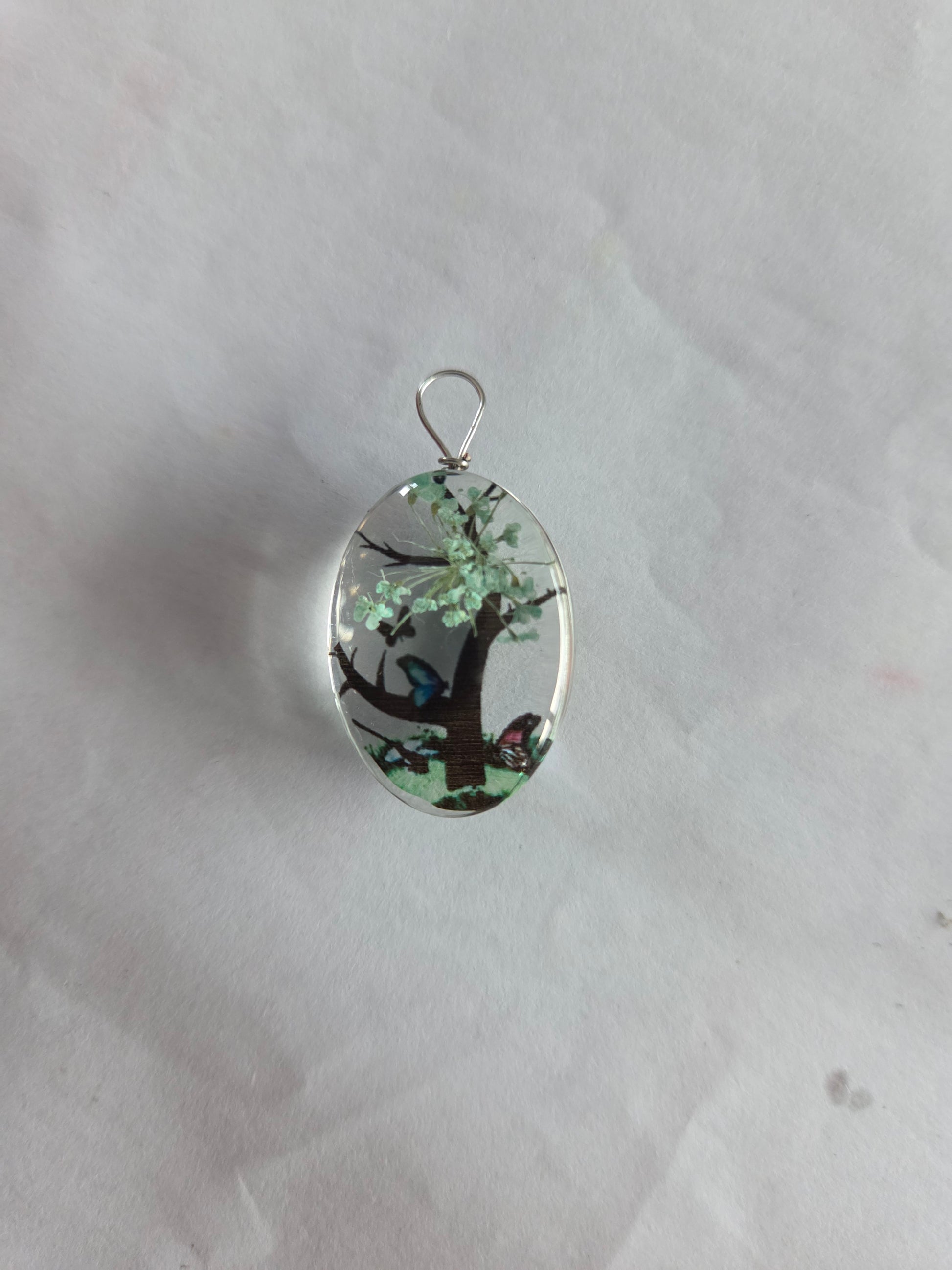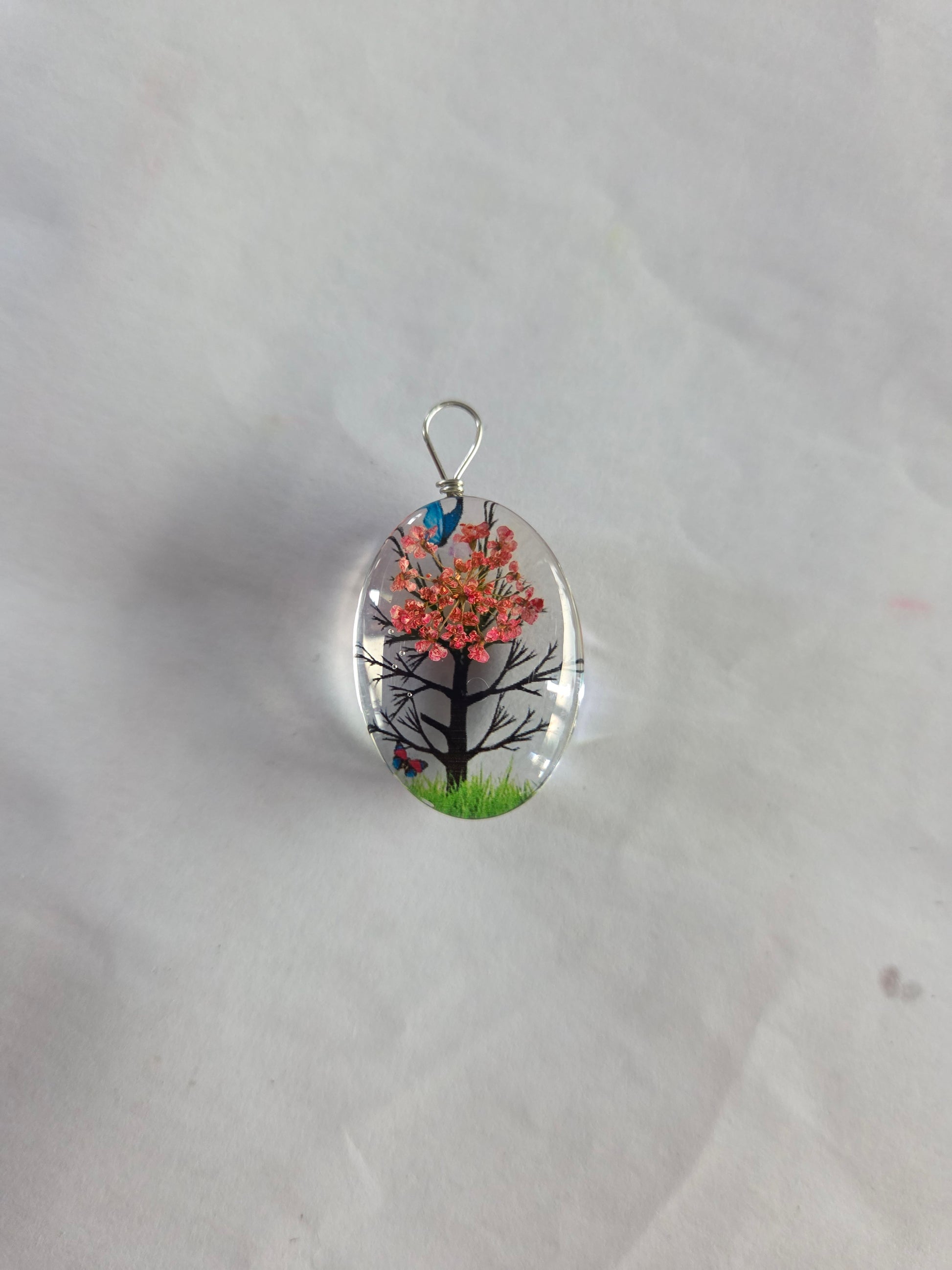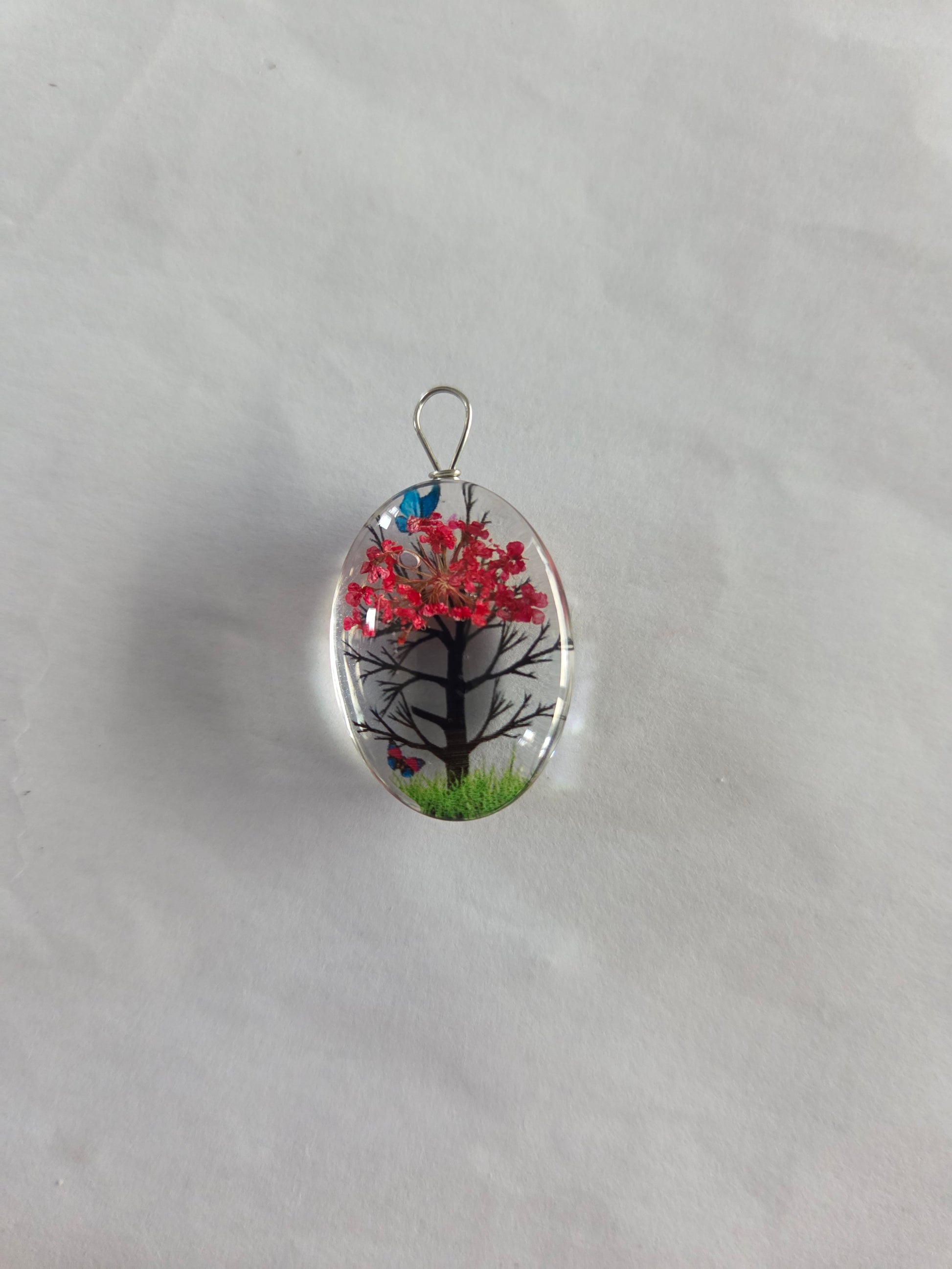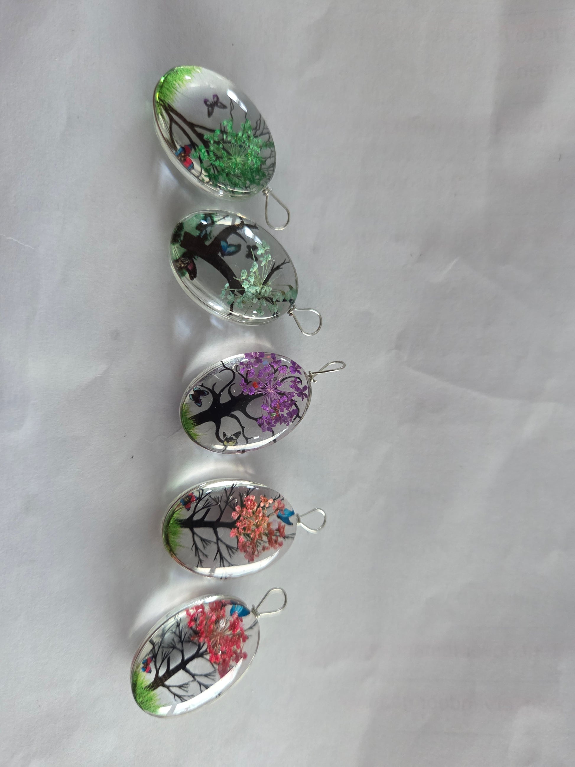 Ovale hangers met miniatuurboompjes in hars, elk in een andere seizoenskleur. Natuurlijke en unieke sieraden.